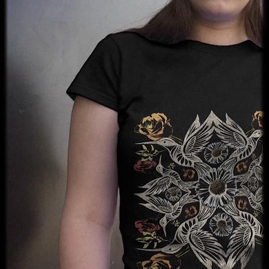 In Bloom — A vibrant geometric arrangement of hummingbirds and blossoming florals, featuring roses, daisies, daffodils, and hibiscus.