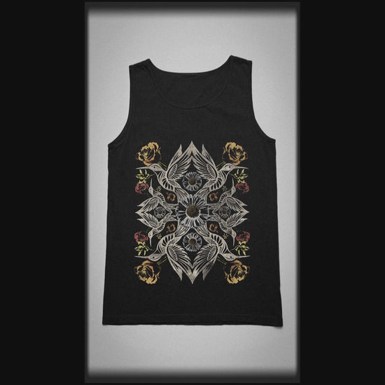 In Bloom — A vibrant geometric arrangement of hummingbirds and blossoming florals, featuring roses, daisies, daffodils, and hibiscus.